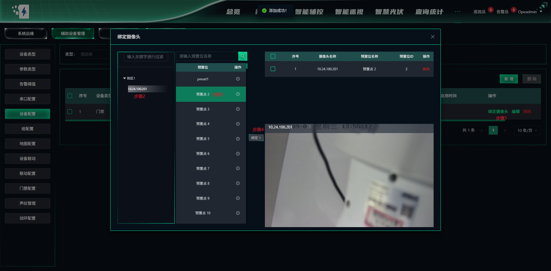 选择要绑定的摄像头及预置位,点击绑定按钮