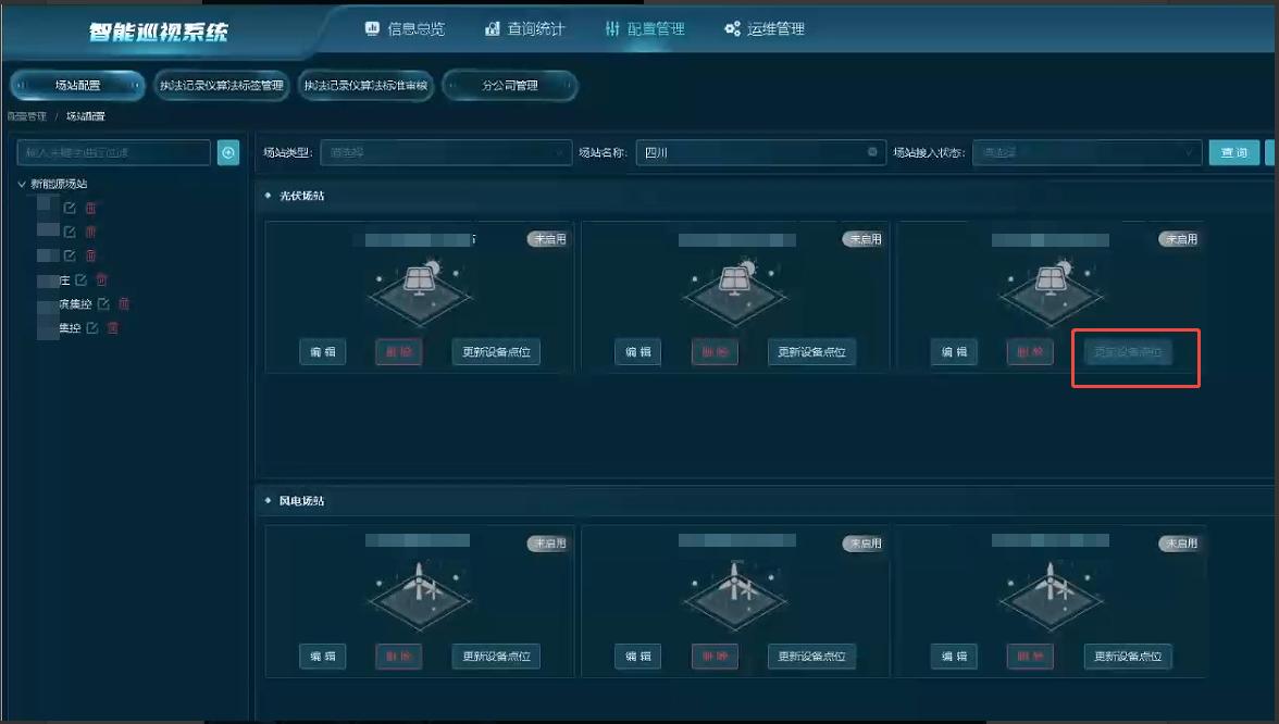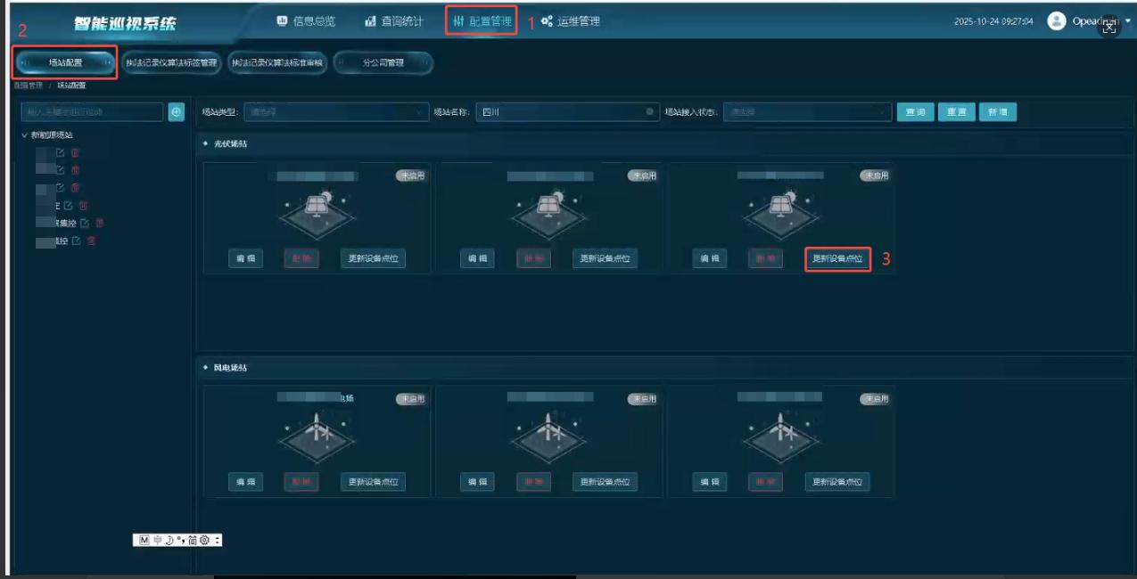 1) 进入“配置管理->场站管理”,查找到需要同步的场站,点击“更新设备点位”按钮, 录入“场站巡检编码”点击“确定”