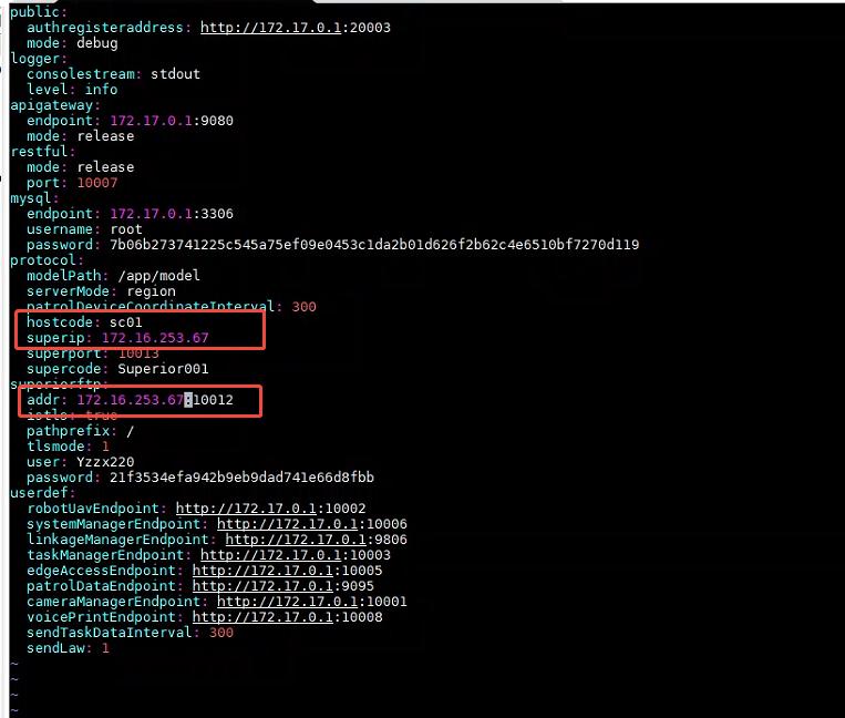 1)通过xshell/mobax 等工具进入到区域主机后台,执行“sudo vim /idea/conf/yaml/north-superior.yaml”,修改图中画框的配置: hostcode: 为本文《3.1》章节步骤三填写的唯一标识 superip 和 addr: 默认值 172.16.253.67