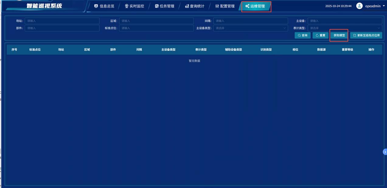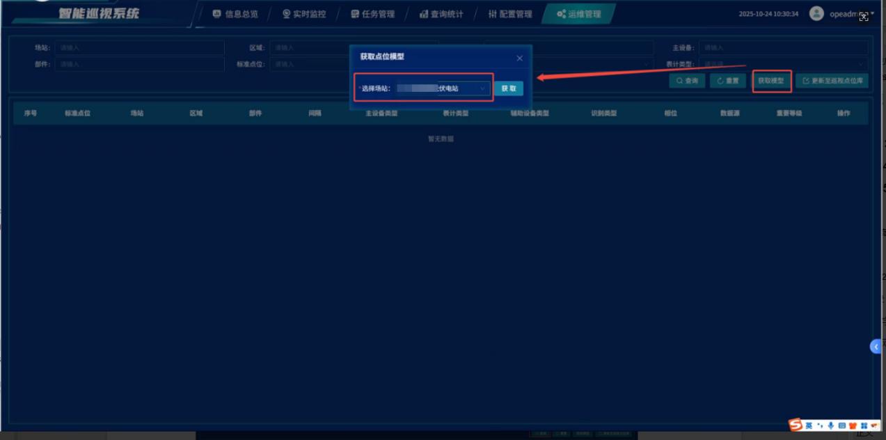 1)登录场站巡检系统,进入“运维管理->一机一档点位”菜单,点击“获取模型”按钮后,点击“获取”按钮,等待同步完成。