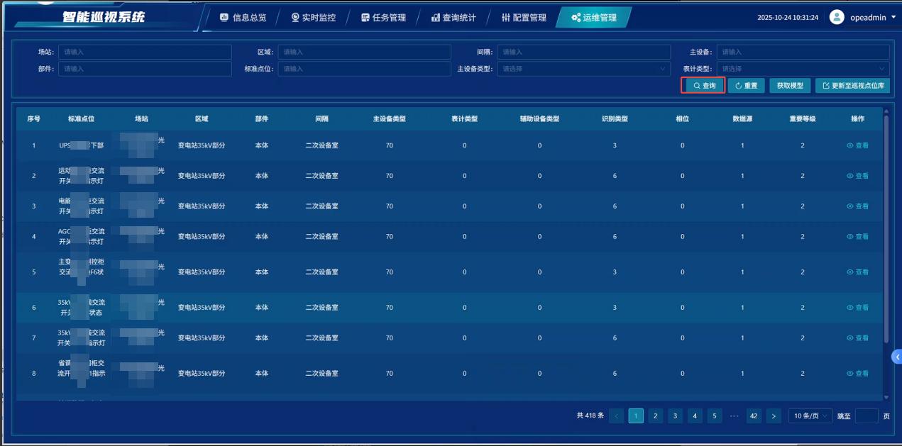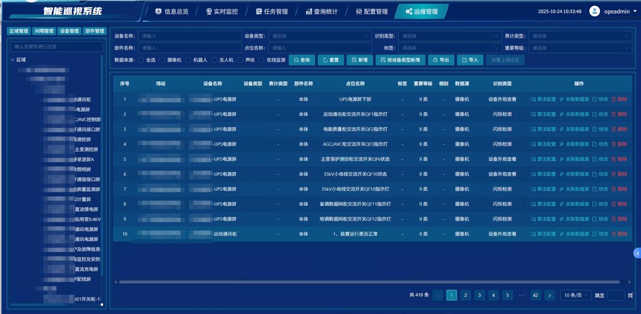 4)进入菜单“运维管理->巡视点位管理”即可看到同步到点位数据,点击“导出”按钮获取点位excel表格,针对表格配置点位使用的算法和关联的摄像机设备及预置位,点击导入后即可执行巡视任务。