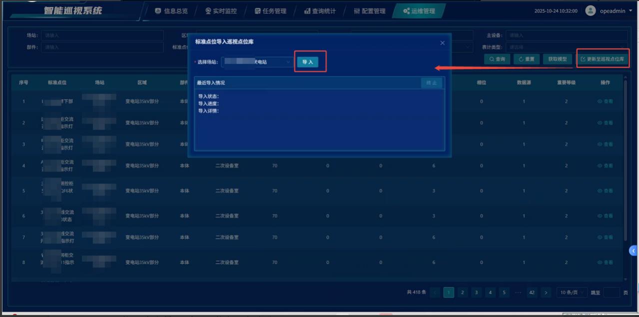3)点击“更新至巡视点位库”,点击“导入”按钮等待完成