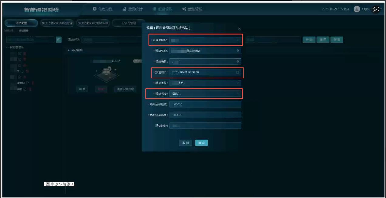 2)场站和区域中心关联,通过“场站名称”查询待修改的场站,点击“编辑”按钮,修改场站“所属集控站”