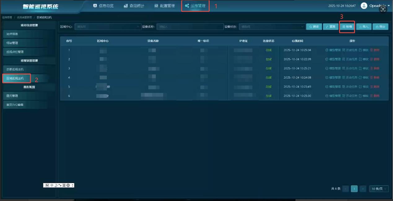 3)添加区域巡视主机,进入菜单:运维管理->区域巡视主机,点击“新增按钮”, 录入巡视主机信息后点击“确定”保存,各字段说明如下: 区域中心: 选择第一步创建的区域中心 唯一标识:每个省的名字拼音首字母+序号,如“山东”第一个区域中心编码为”sd01” ip地址:集控站的IP 心跳间隔:300 巡视设备运行数据间隔:3600 无人机机巢运行数据间隔:3600 环境数据间隔:3600 投运时间:当天