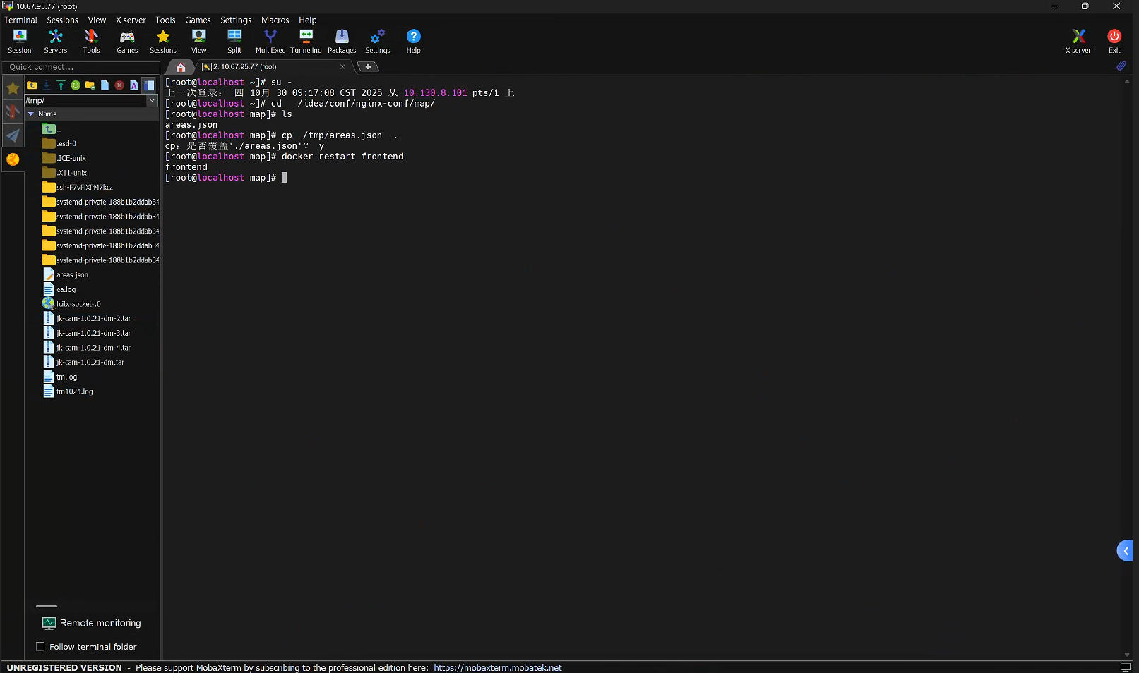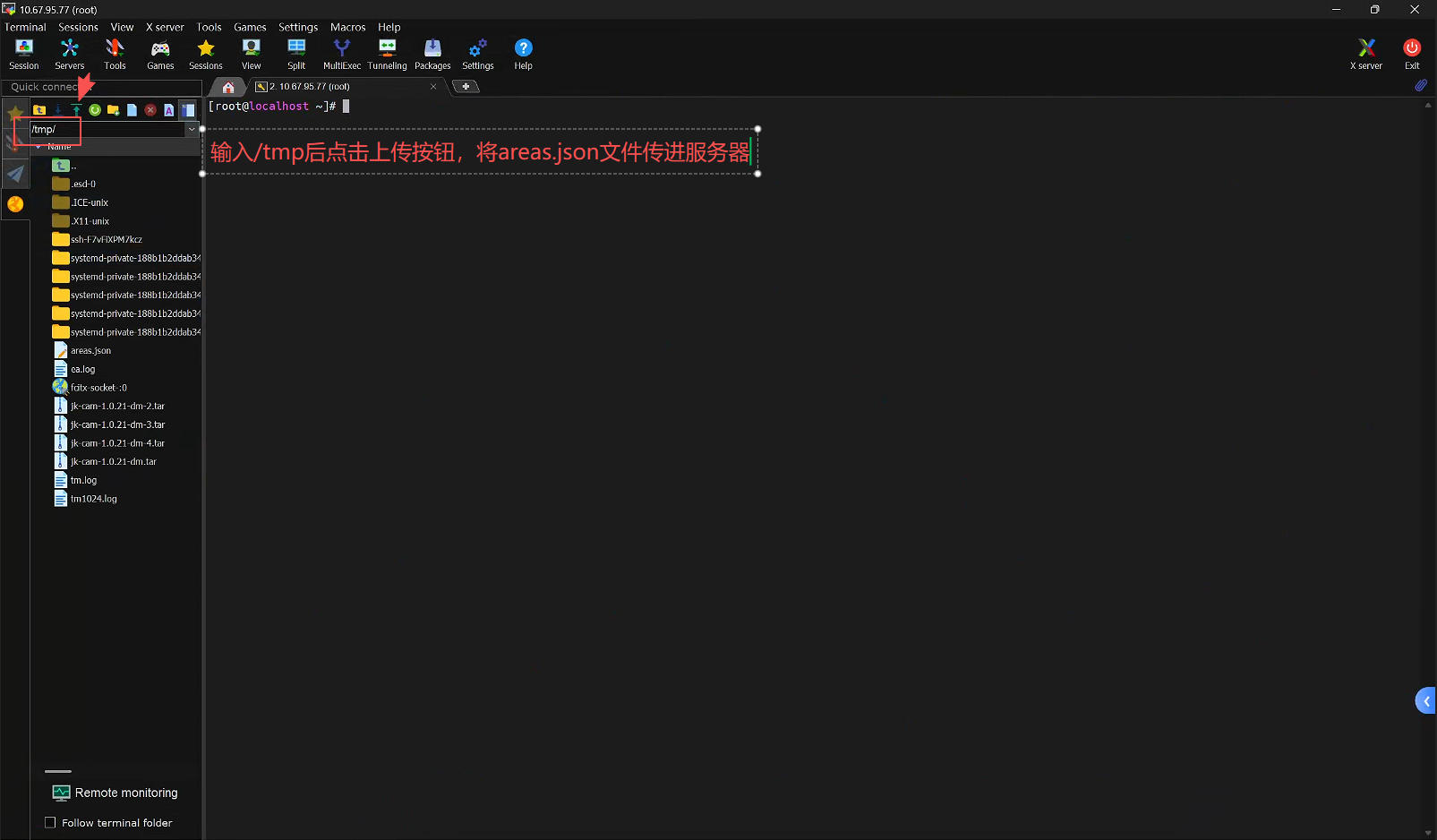 使用mobaxterm或者其他工具将areas.json上传到服务器/tmp中